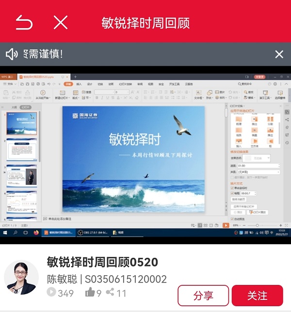 2022年5月20日,国海证券玉林玉东大道证券营业部投资顾问陈敏聪老师通过线上方式开展敏锐择时投教活动。此期活动主要内容是对本周产品走势进行回顾与分析,引导投资者树立理性投资理念,控制风险,谨慎投资。据后台数据显示,本次线上投教活动观看人数为349人,9名投资者点赞,11名投资者进行了转发分享。