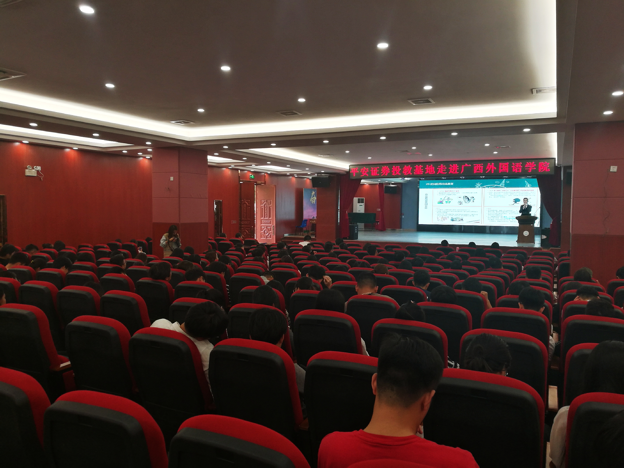 为积极响应中国证监会号召,加强资本市场投资者合法权益保护,帮助在校大学生丰富金融知识,树立科学、理性的理财观和价值观,2018年10月9日,平安证券投资者教育基地走进广西外国语学院,举办了一场别开生面的“大学生如何正确认识金融安全”专题讲座。